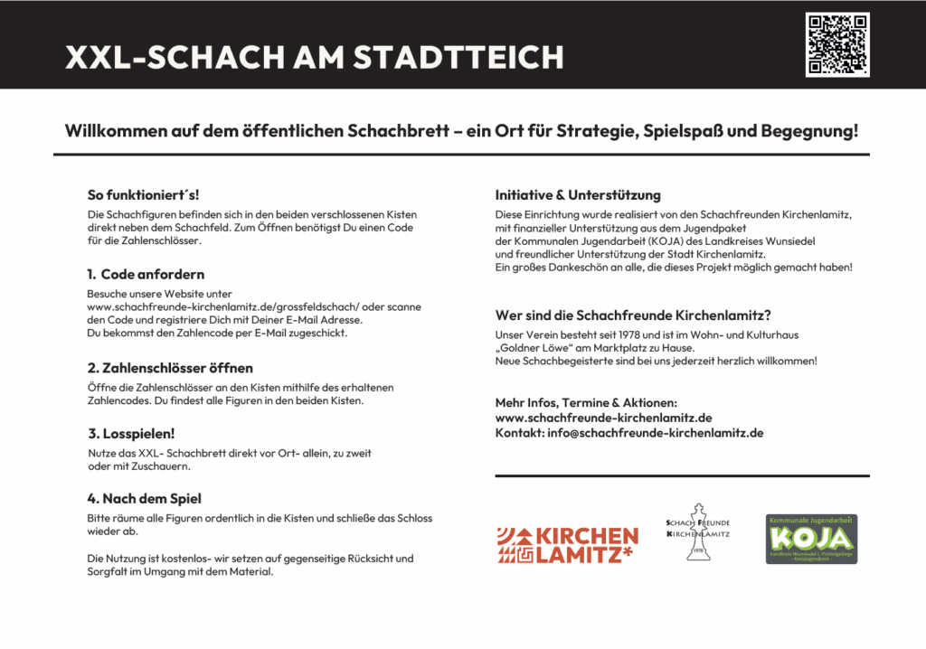 Willkommen beim Großfeldschach am Stadtteich in Kirchenlamitz! Hier bekommst Du den Code für die Zahlenschlösser, die sich an den Kisten befinden. Du musst dazu nur das untenstehende Formular ausfüllen – dann erhältst du eine E-Mail mit dem Code. Damit kannst Du die beiden Kisten mit den Figuren öffnen. Wir wünschen viel Spaß beim Spielen!